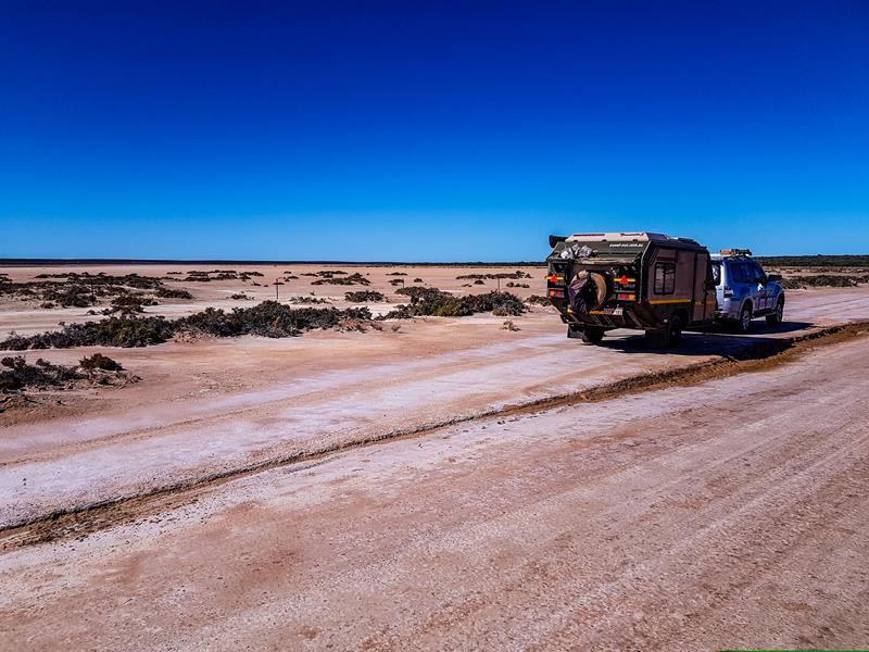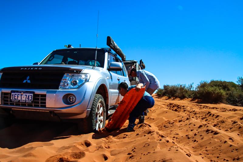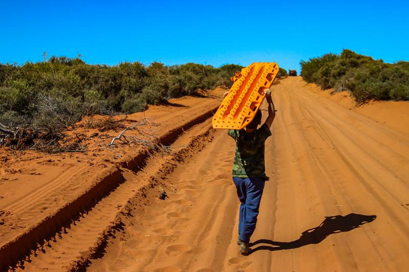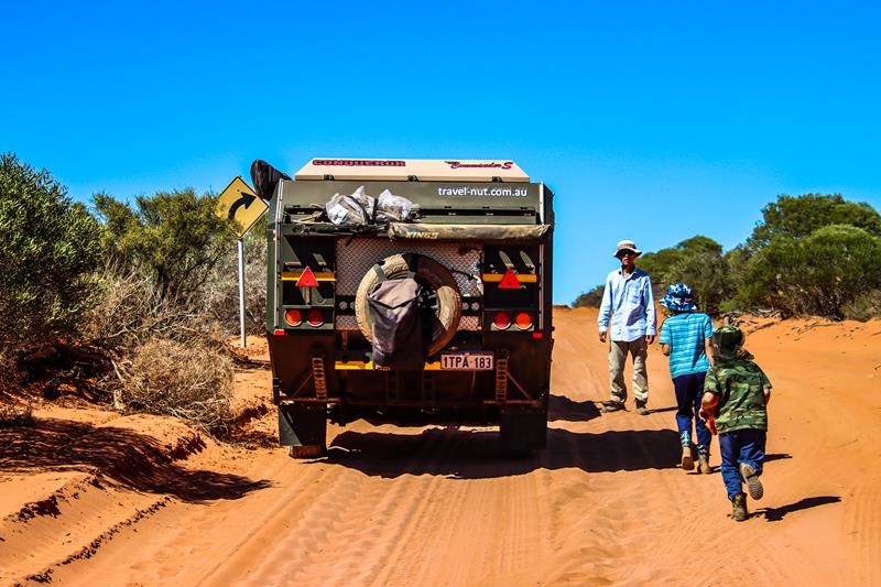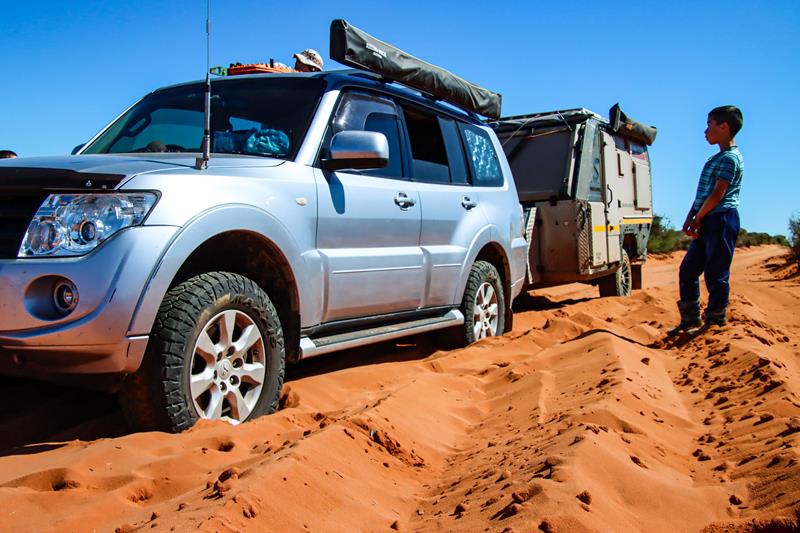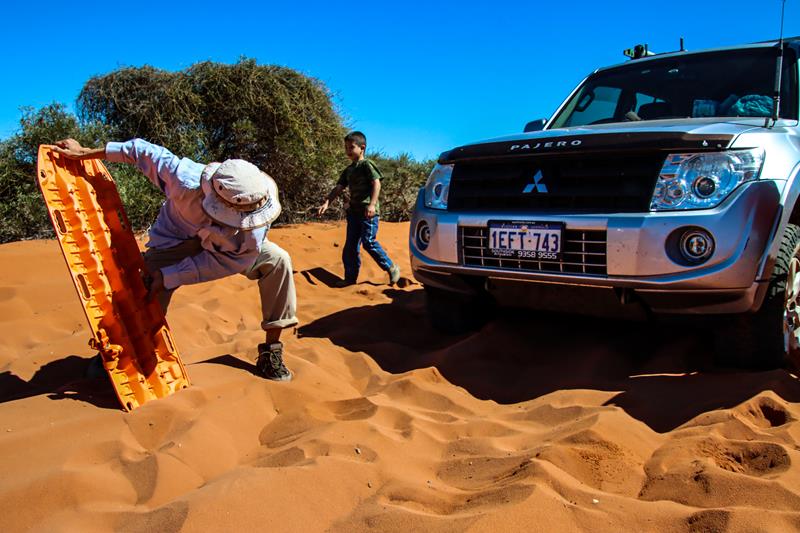 We managed to tow our caravan safely to Bottle Bay and nearly all the way back, past the most soft and corrugated parts of the road between Cattle Well and Gregories. But just before Kraskoe’s Tank, we got bogged! There was a lot of ongoing traffic on our way back from Bottle Bay and in an attempt to consider others, we moved to the side of the track, giving way to ongoing traffic. It seems that the sand was blown into a pile and it happened to be very soft there. So we got bogged, blocking the track to a couple of vehicles behind us and ahead of us.