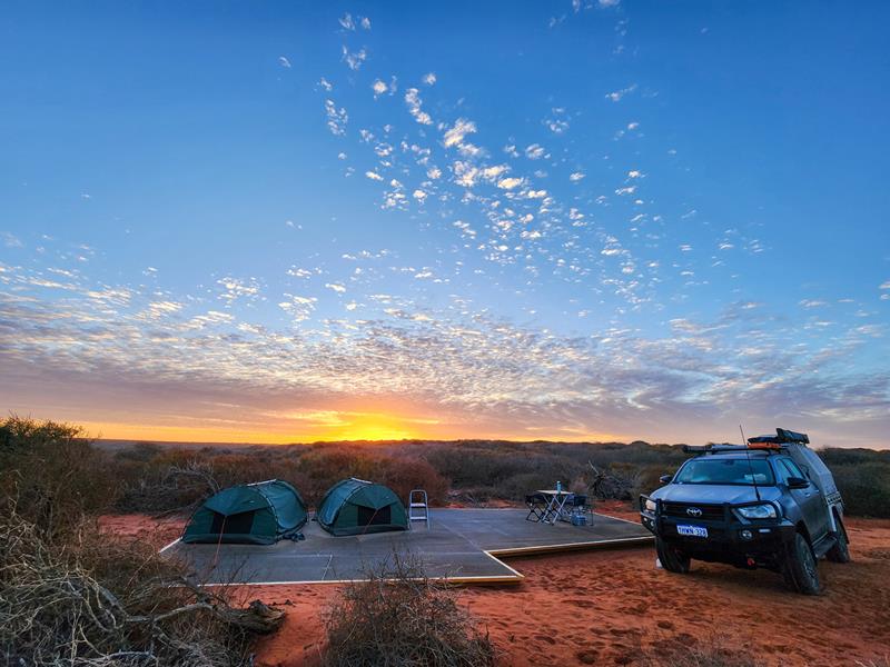 Another way to enjoy this lovely place is to have a picnic or camp there. Big Lagoon campground is the biggest within Francois Peron National Park. There are 19 sites of various sizes and layout but all are quite big. Some sites are drive through. Others have metal raised platforms for tents and swags. All sites can accommodate minimum 2 vehicles. Facilities include 4 long drop well maintained toilets in various parts of the campground. There is also adjacent day use picnic area with sheltered decking, tables, BBQs. Sites are non-bookable. You can fish from the shores of the lagoon near the campground.